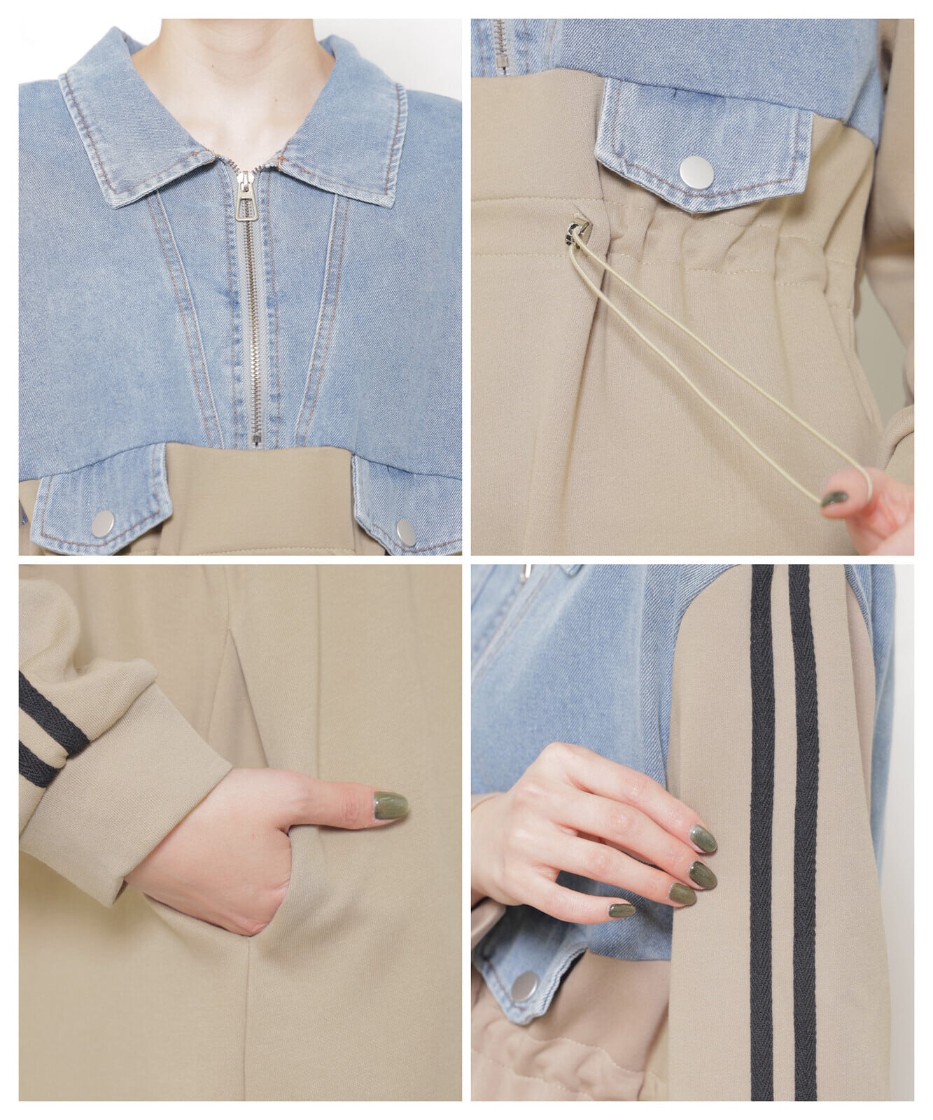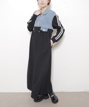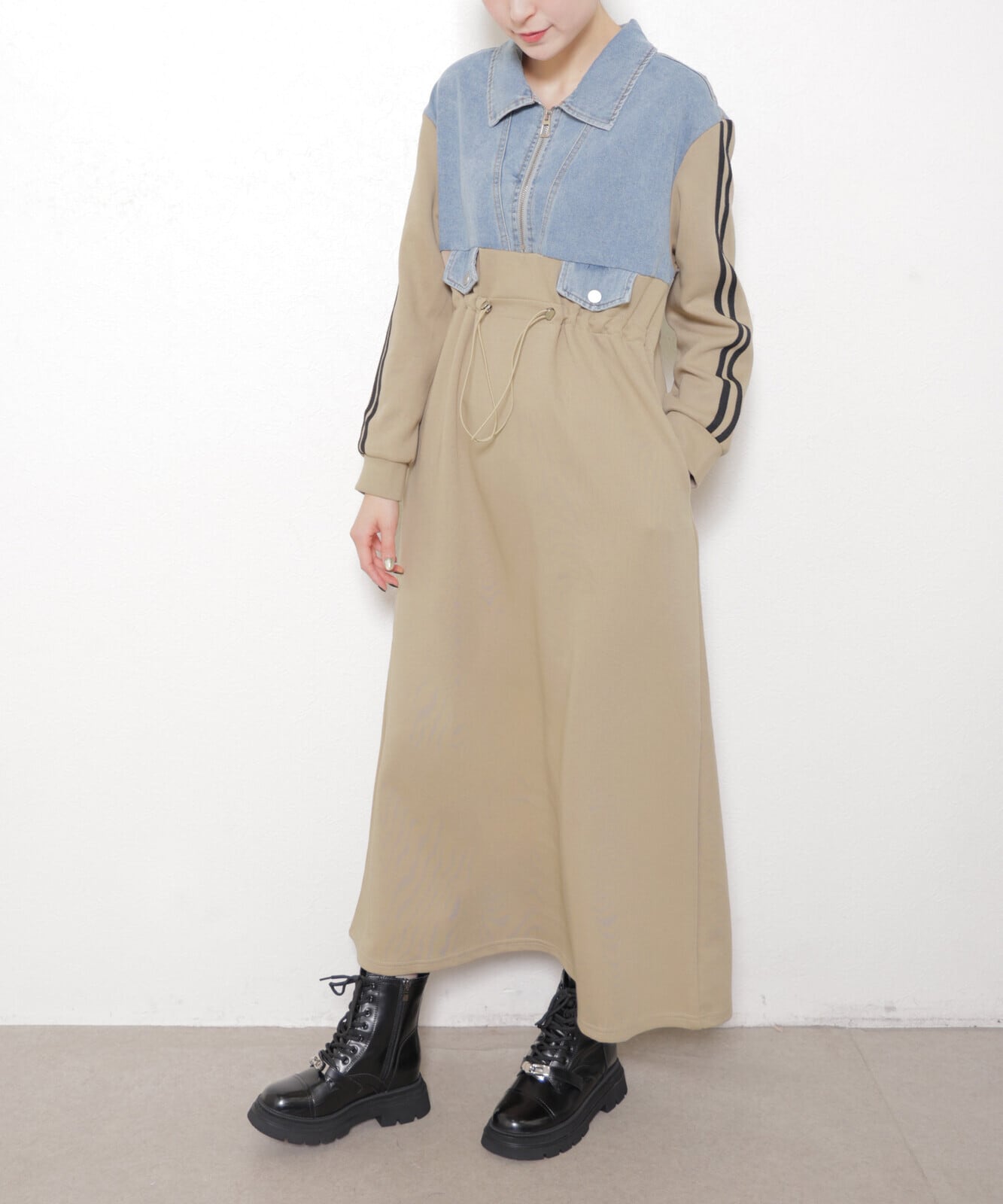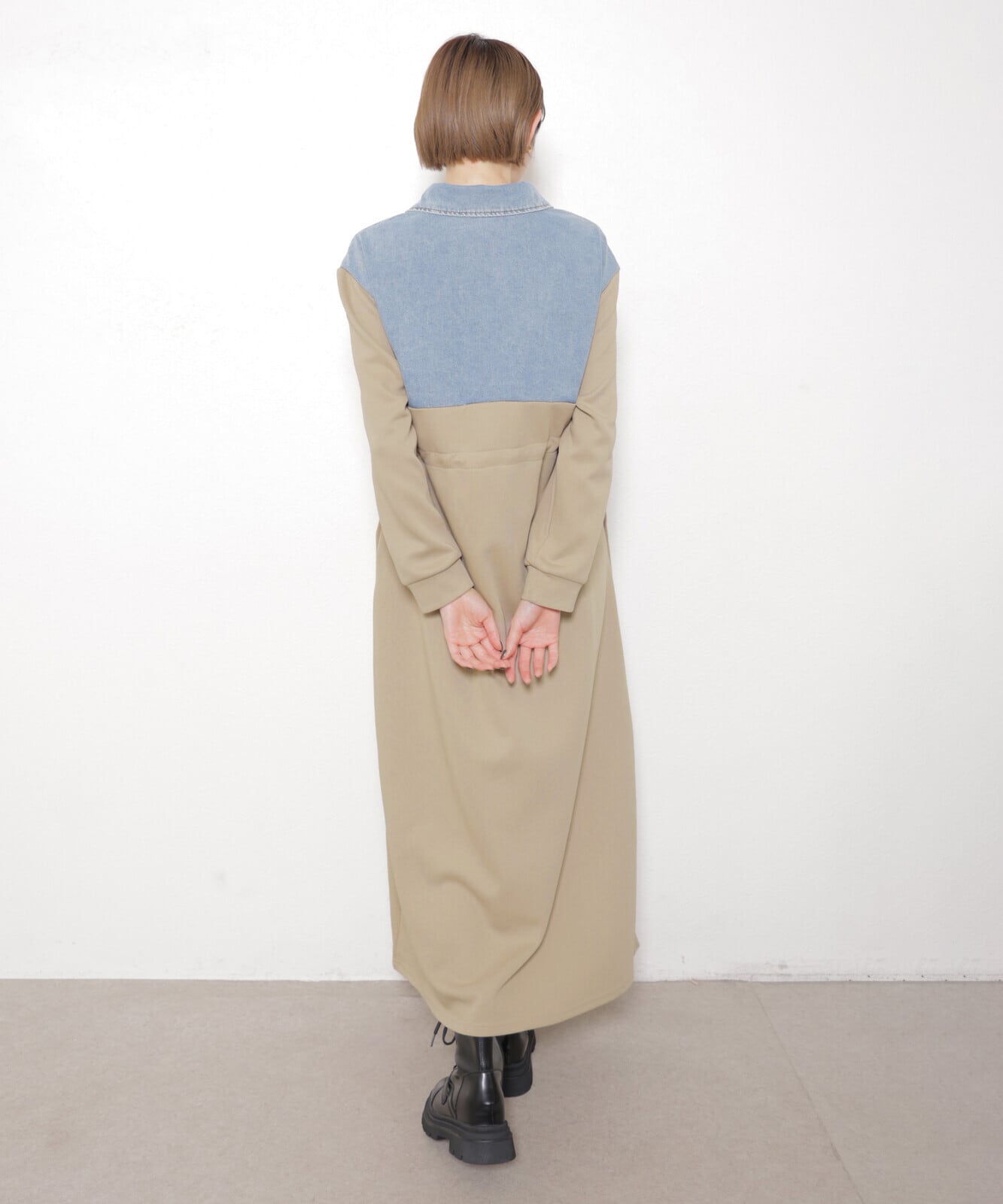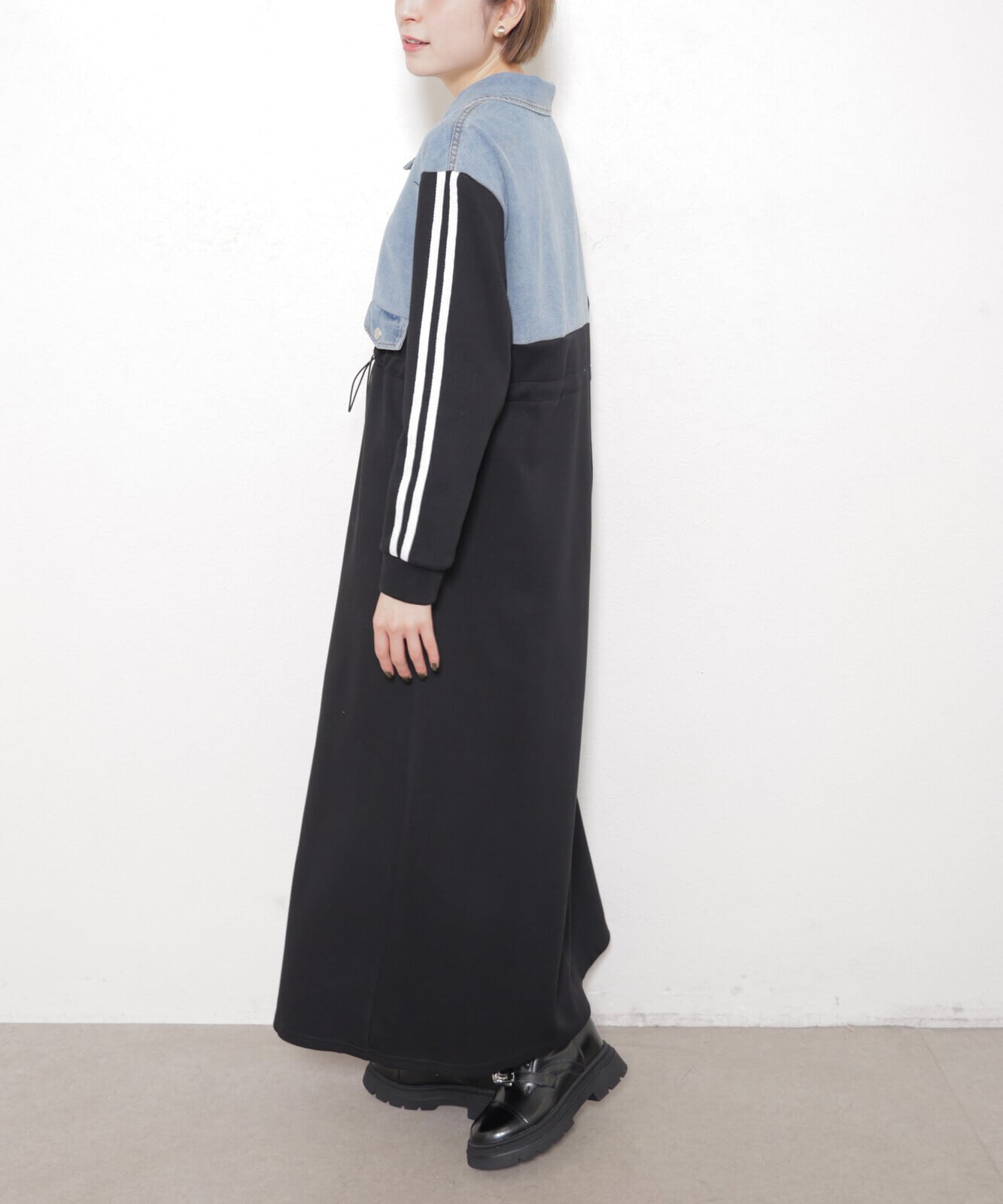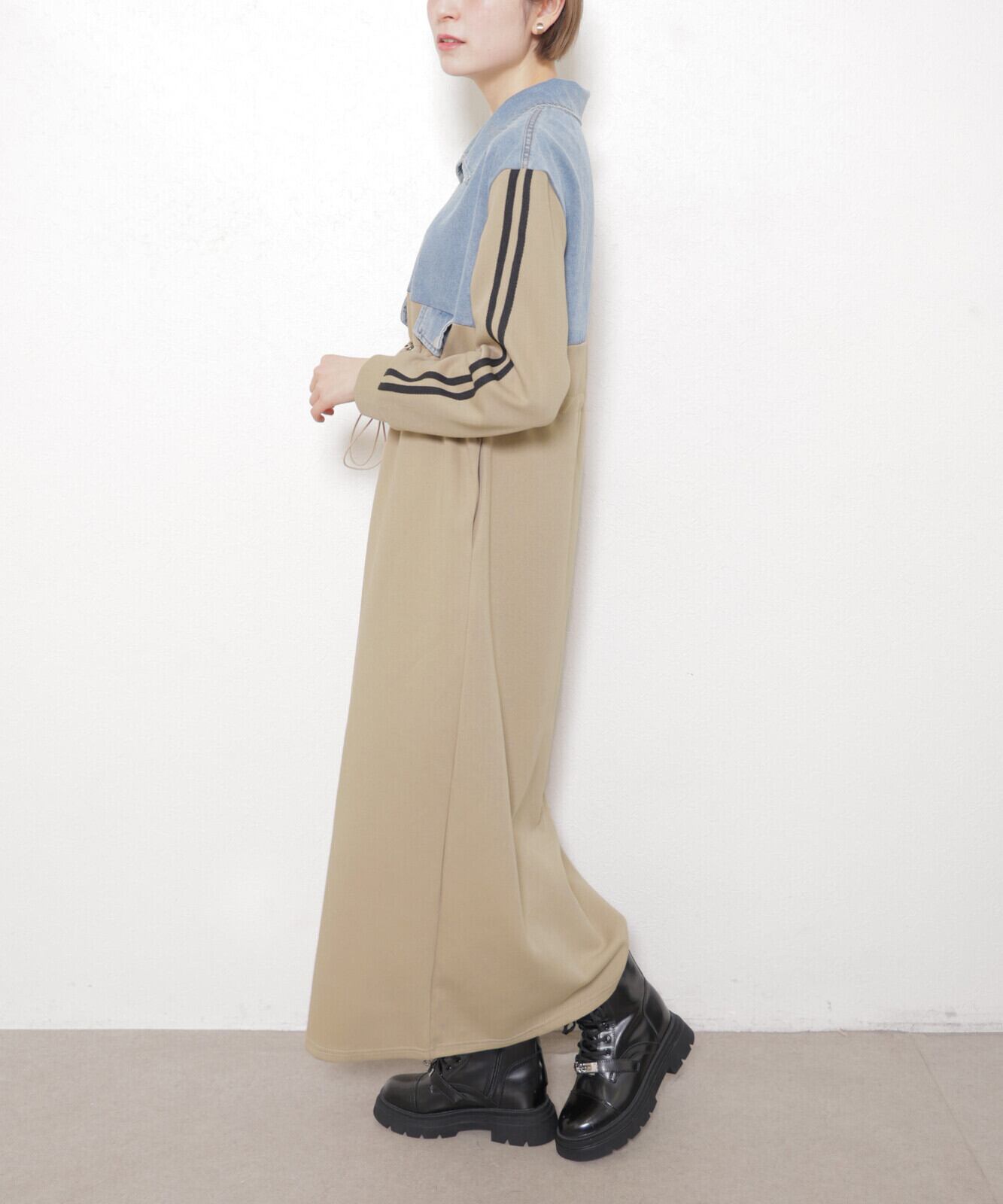 デニム切替と袖のダブルラインがカジュアルなワンピース。