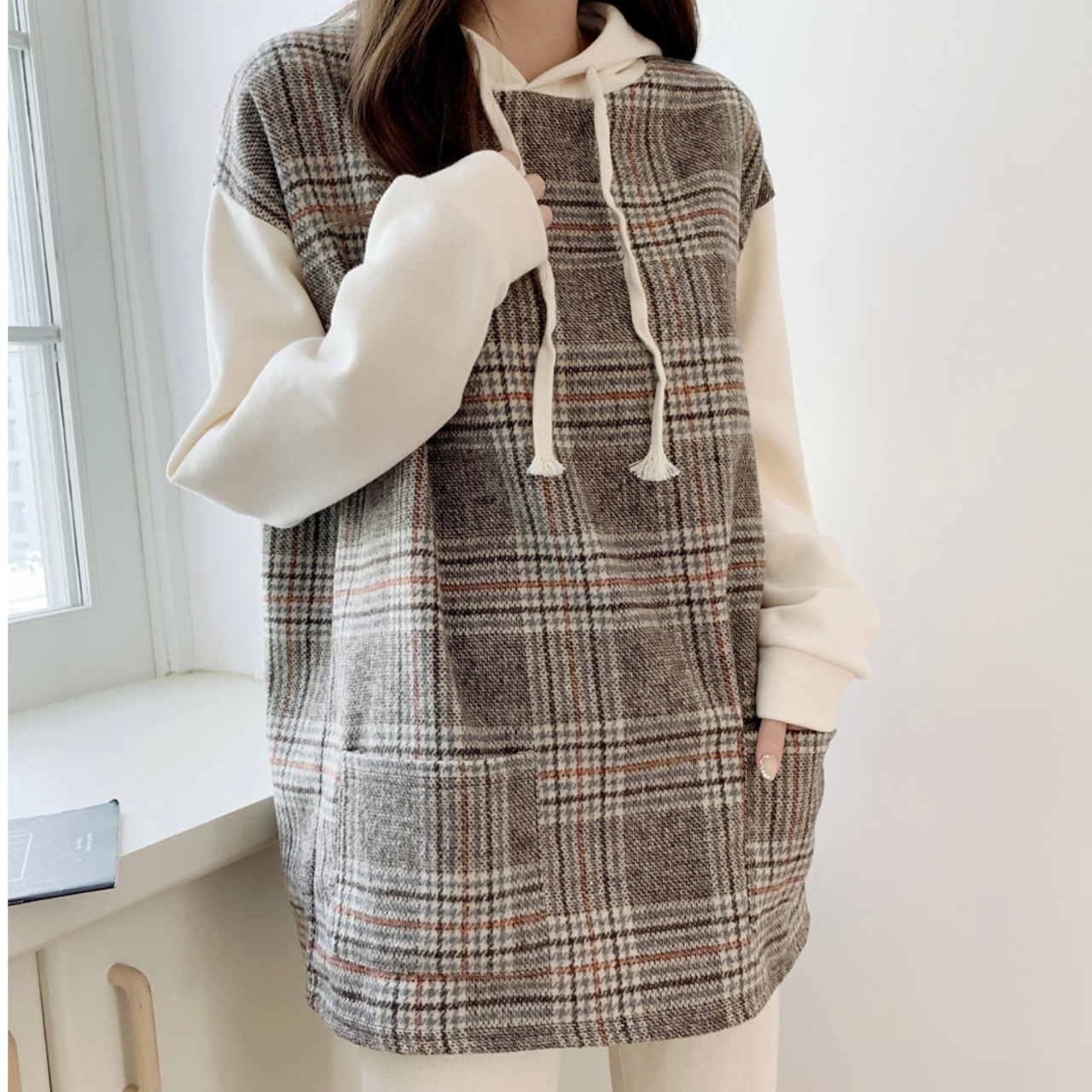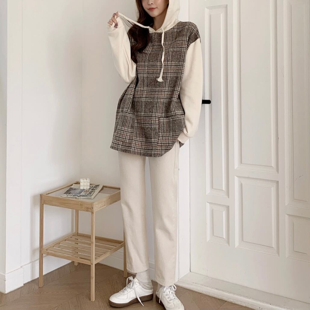 【price down】チェック柄 フード付きトップス パーカー フーディー