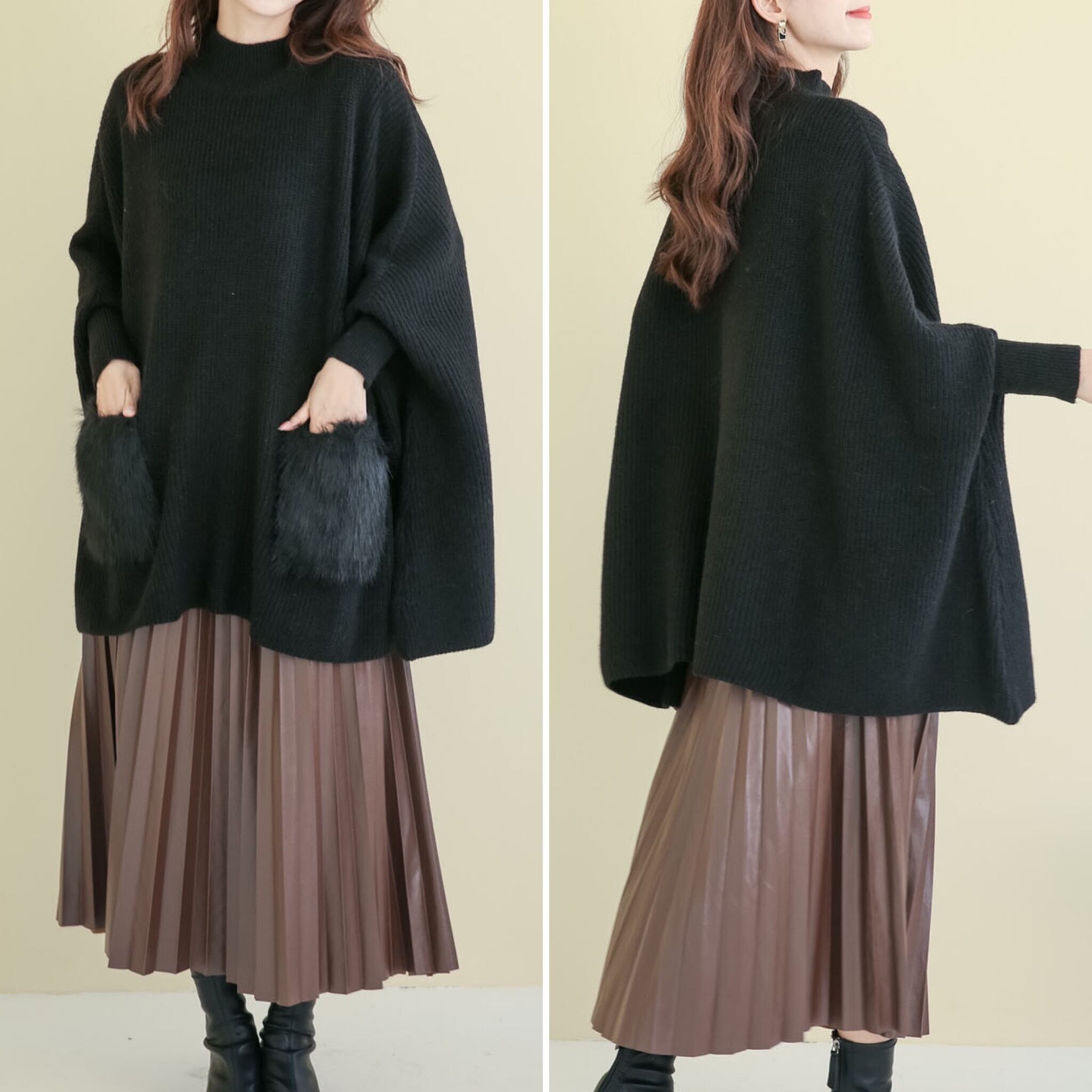 ファーポケット付きポンチョニット