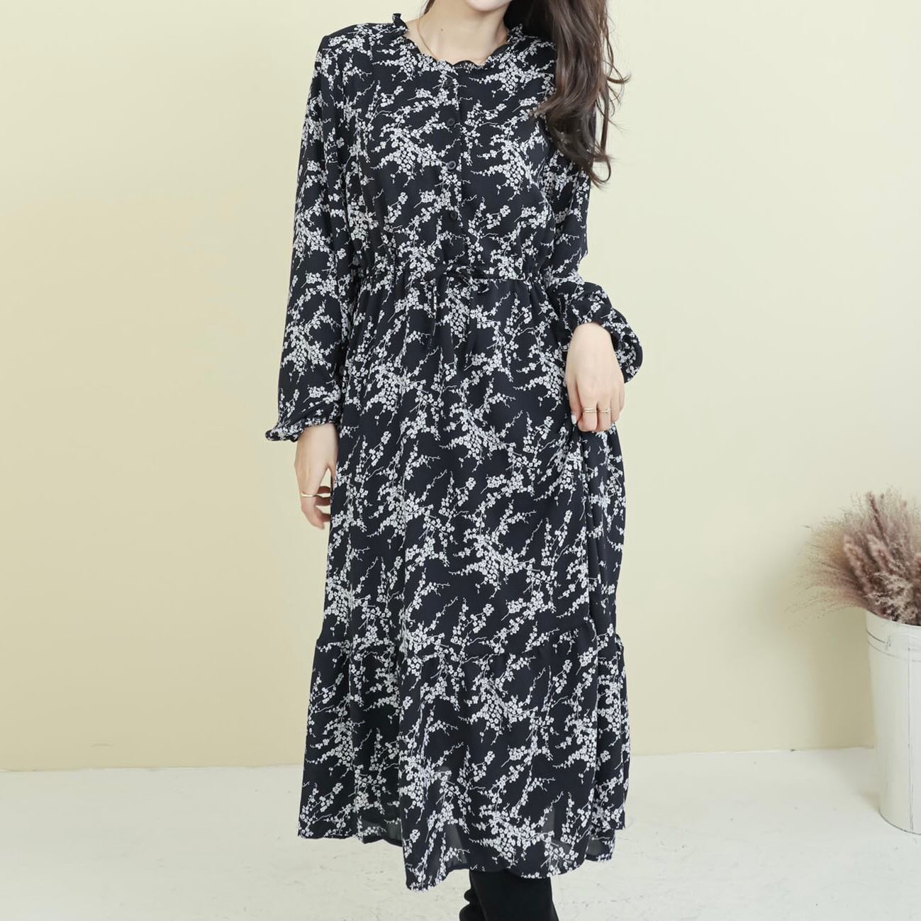 小花柄フリルネックフレアワンピース