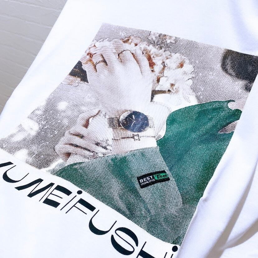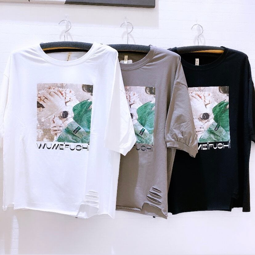 プリント入り裾ダメージTシャツ