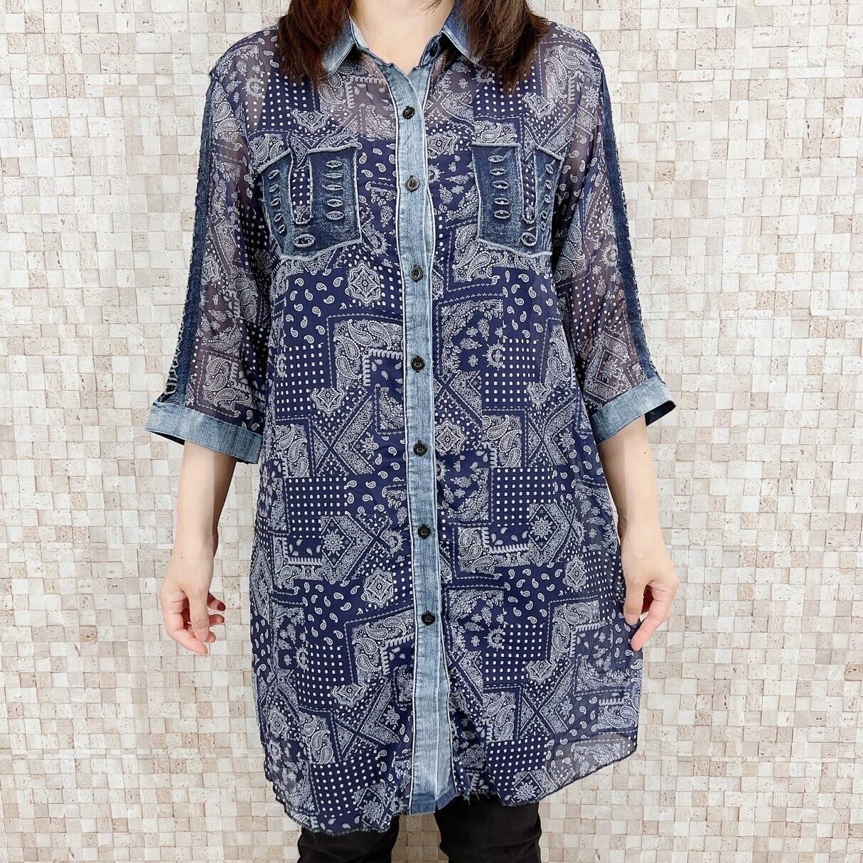ペイズリー柄シフォン×デニム シャツ