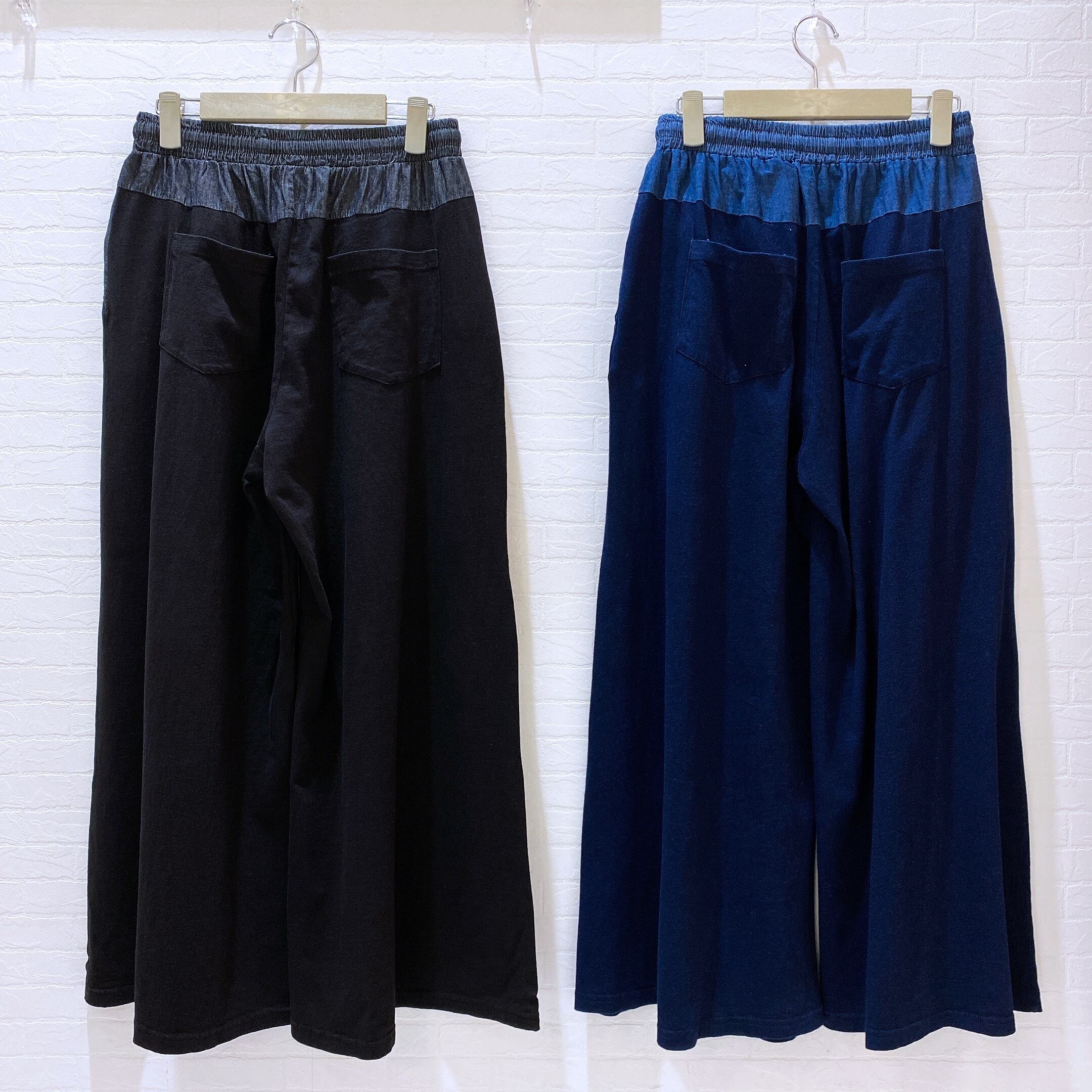 深みのあるインディゴ染めの天竺生地とデニム生地で切り替えたフレアパンツ♪